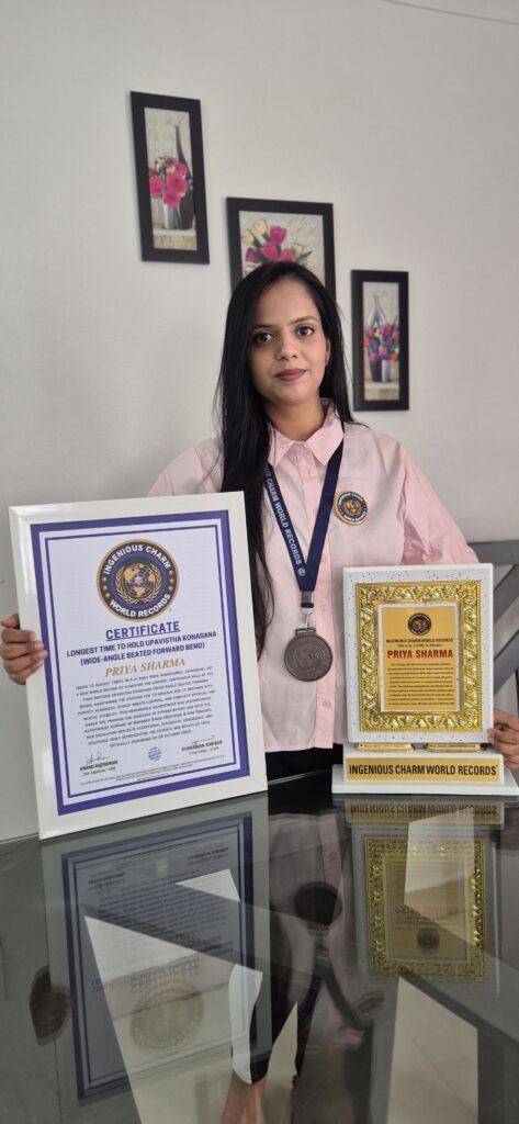 इसके साथ ही प्रिया ने अपने कोच मंदीप सिंह का भी हार्दिक धन्यवाद किया। उन्होंने बताया कि मंदीप सिंह के सही मार्गदर्शन, पोषण संबंधी सलाह तथा परफेक्ट फॉर्म पर ध्यान की वजह से ही यह विश्व रिकॉर्ड संभव हो पाया। उन्होंने यह भी कहा कि लगातार दो महीनों की कड़ी मेहनत और अनुशासन ने उन्हें इस चुनौतीपूर्ण आसन को लंबे समय तक होल्ड करने में सक्षम बनाया।