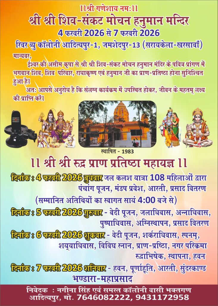आज आदित्यपुर 1 रिवर व्यू कॉलोनी स्थित नवनिर्मित श्री श्री शिव संकट मोचन हनुमान मंदिर के प्रांगण में भगवान शिव, शिव परिवार, राधाकृष्ण एवं हनुमान जी का प्राण प्रतिष्ठा हेतु श्री श्री रुद्र प्राण प्रतिष्ठा महायज्ञ का शुभारंभ किया गया।